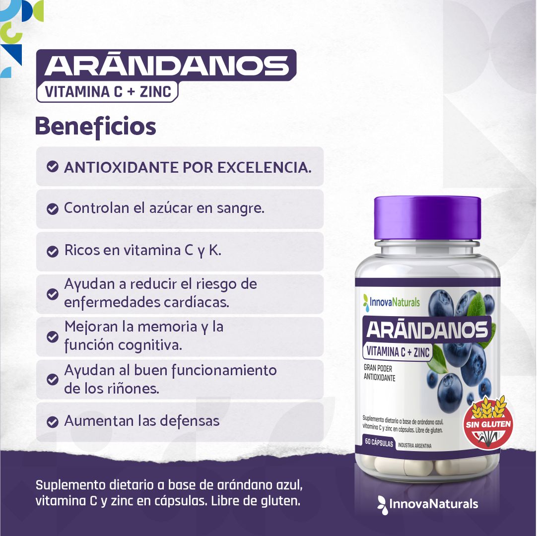 La combinación de los arándanos con la vitamina C y el Zinc, potencian aún más sus propiedades, lo que hace que sea un suplemento ideal para complementar la alimentación diaria.