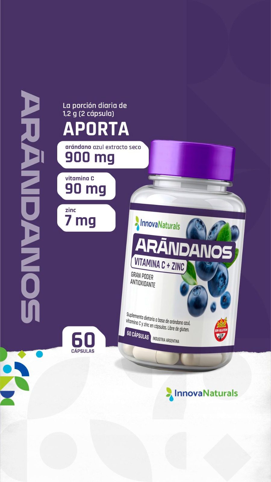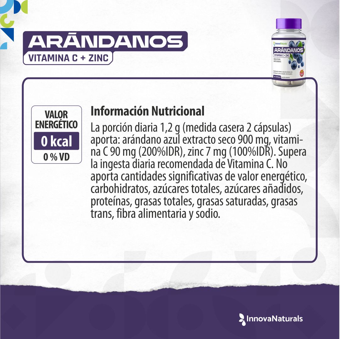 INFORMACIÓN NUTRICIONAL (por porción=2 cápsulas) 900mg de extracto seco de arándanos azul; 90mg de Vitamina C y 7mg de Zinc.