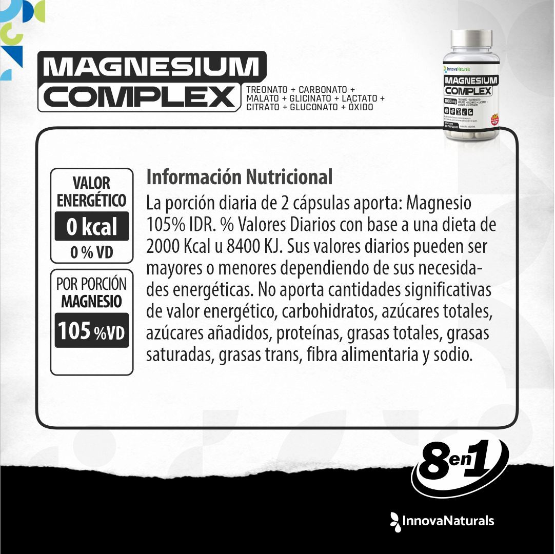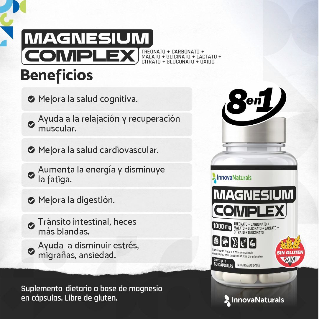 El MAGNESIUN COMPLEX, es una combinación de MAGNESIO con 8 moléculas distintas, mejorando su absorción e incorporando mayor cantidad de magnesio elemental.