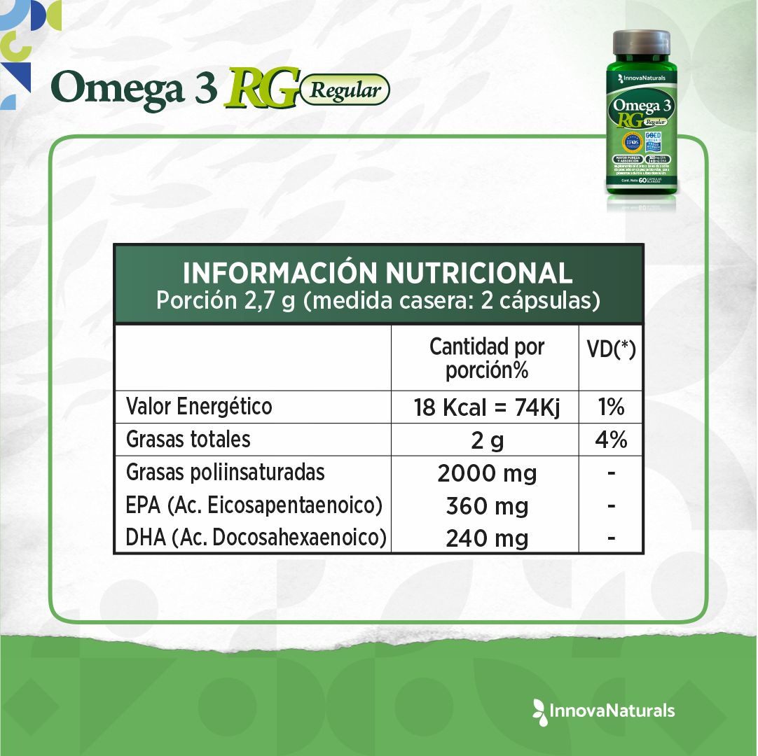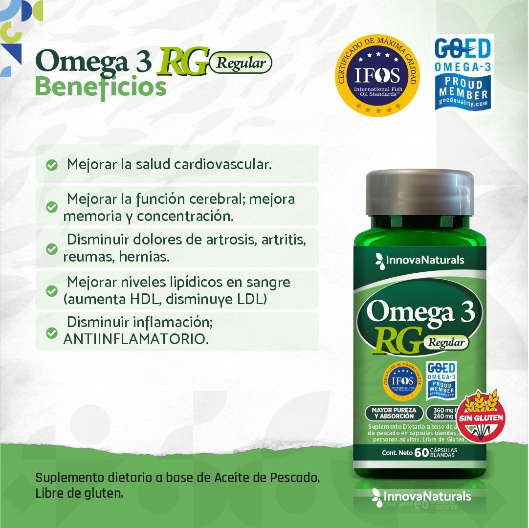 Omega 3 REGULAR representa un excelente suplemento para modular la inflamación celular, la salud cardiovascular, la salud cerebral, la protección inmunológica, y prevenir enfermedades crónico-degenerativas. Una forma segura y económica de aportar ácidos grasos EPA y DHA.
